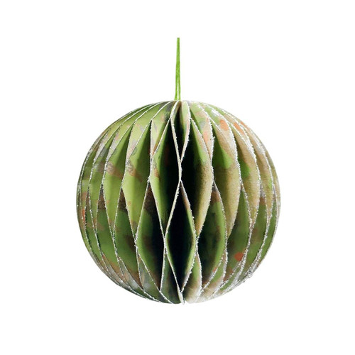 Crafted from high-quality, eco-friendly materials, this bauble is designed in a distinctive honeycomb structure that showcases intricate folds and patterns. The deep green base is accentuated with earthy hues of brown and orange, evoking a connection to nature and paying homage to Aboriginal artistry. A light dusting of glitter along the edges adds a frosty shimmer, creating a dazzling effect when caught by the glow of Christmas lights or sunlight.