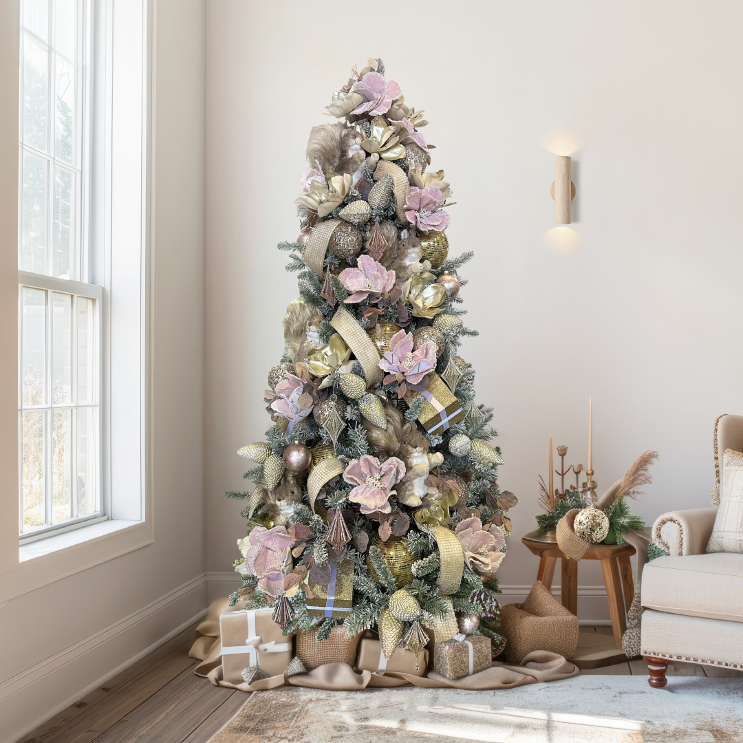 If understated elegance is your cup of tea, then look to our Bohemian Chic tree for your decorating inspo. The blend of soft browns and creams with dusty pinks, soft golds, and muted greens conveys a cozy femininity. Rustic hessian ribbon, cuddly squirrel figurines, soft magnolia floristry, and shiny baubles offer a playful take on Danish hygge. Immerse yourself in Bohemian Chic and transform you home with vignettes, centrepieces, wreaths, and more that draw upon this look. Who knows? These colours and textures are so on-trend that you might dream of returning to them when you want to redecorate.