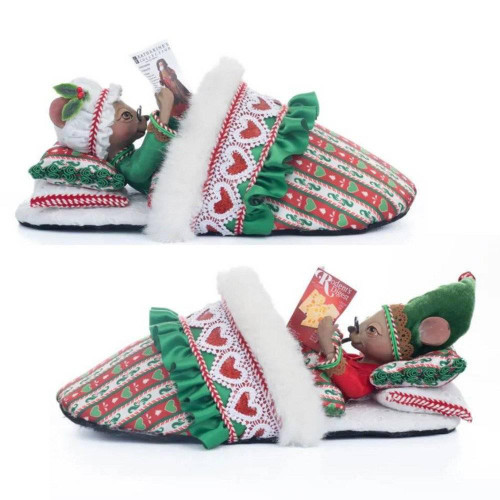 Even a mouse couldn't be bothered to move. This pair, in particular, is all settled in and prepared for bedtime. The mice are winding down for the day by reading magazines while resting their heads on a stack of two decorative pillows and donning matching black framed eyewear. They're tucked into a pair of fluffy, striped slippers with a white fur pom pom. These are so cute, they'd be perfect for the holidays on your mantel or coffee table!