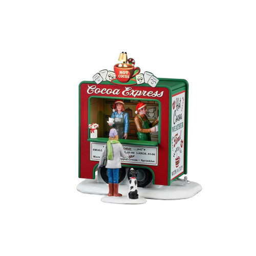 The main body of the cocoa cart is a cheerful red, reminiscent of classic holiday décor. Contrasting this, the roof is a bright and fresh green, adding a playful touch. The cart is adorned with white lettering that clearly spells out "Hot Cocoa Express," making it instantly recognisable.