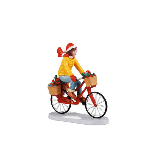A charming festive scene unfolds as this lovely girl pedals merrily on her bicycle, balancing an abundance of Christmas gifts. The joy of giving radiates through her as she spreads the holiday’s joy and wonder.
