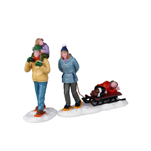 It’s lucky that Mom and Dad can still keep going after a Long Day Snowshoeing and dragging the sled up and down the slopes for their girls to ride it. It’s time to get the sisters home so Dad carries one on his shoulders while Mom’s in charge of pulling the sled with its precious cargo. This family set can be placed anywhere in Vail Village for a touch of personality.