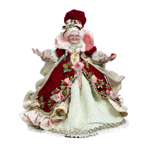 Step into a sugary wonderland with the Mark Roberts Candy Mrs Claus. This collectable holiday centrepiece features Mrs. Claus in an opulent gown of rich burgundy velvet and shimmering gold lamé, accented with soft blush pink ruffles. Her bodice is adorned with jewelled appliqués, dainty faux pearls, and a cascade of hand-placed florals, including satin roses and berry sprigs.