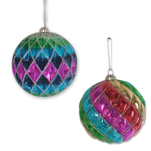 Decorate your home for the holidays with these beautiful crisscrossed baubles. At 10cm, they are a great size for hanging on a Christmas tree or from festive garlands. Each bauble is decorated with a multicoloured, geometric pattern featuring glitter highlights. The baubles are available in two styles, offering a bright and colourful addition to your decorations.