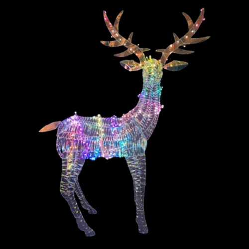 This is a large, outdoor reindeer decoration that comes with a remote control to change the colours of the LED lights. A variety of multicoloured LED lights illuminate the clear acrylic reindeer. The lights can be set to a variety of different colours, including red, green, blue, yellow, orange, purple, and pink. The reindeer also has a built-in timer that can be set to turn the lights on and off automatically. A strong metal framework supports this outdoor ornament.