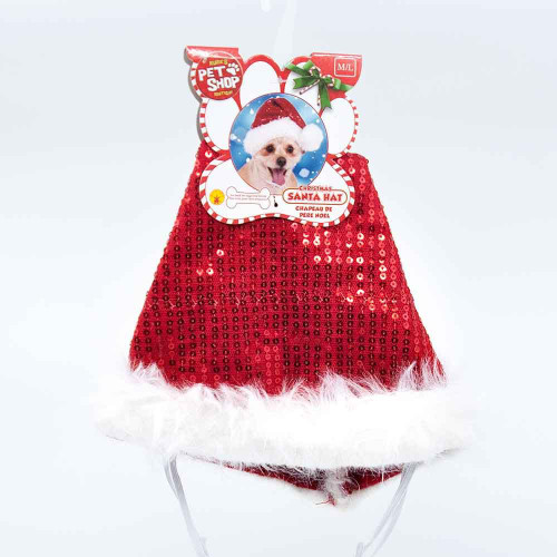 Put some holiday cheer into your pet's life with this adorable Santa hat.  This red sequin hat has a white pom pom and an elastic band for a secure fit. The brim is finished with white faux fur.